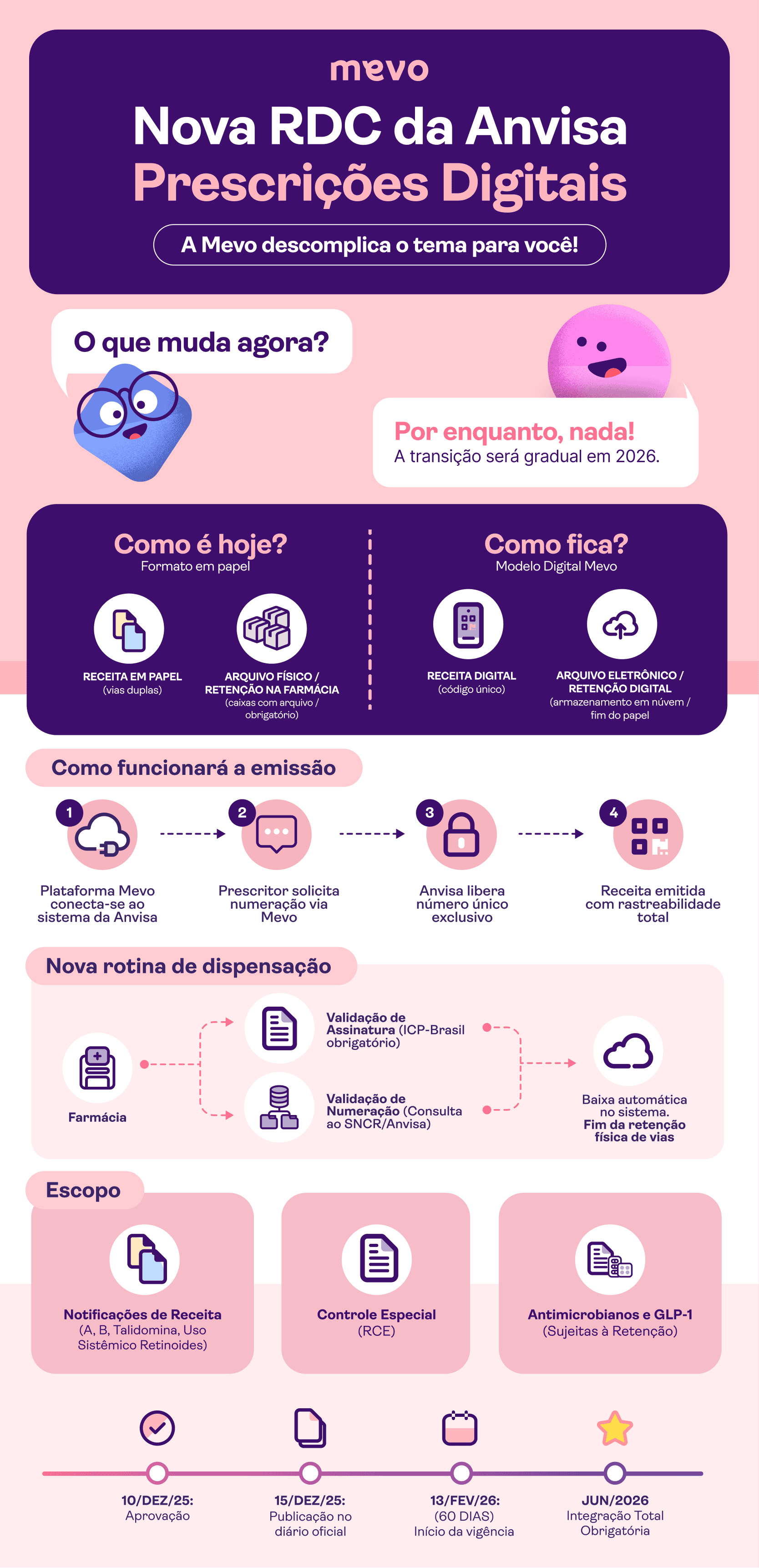 Para facilitar o entendimento da nova RDC, a Mevo criou um “Infográfico autoexplicativo” para você visualizar de forma rápida tudo o que precisa saber e compartilhar com a sua equipe. Mas se preferir um resumo completo com os principais pontos abordados, clica aqui que também te deixamos por dentro das novas normas publicadas.