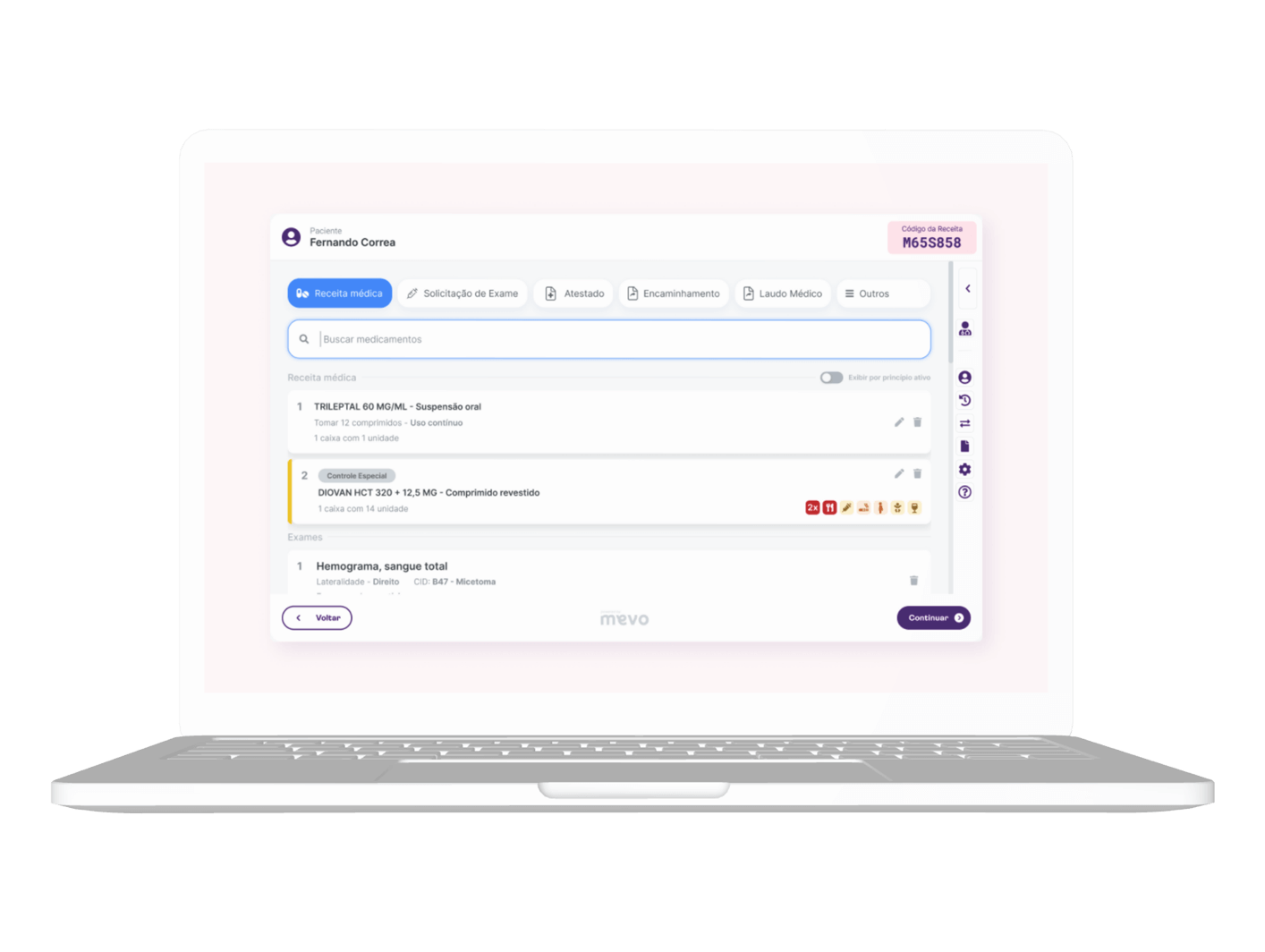 Na hora de prescrever a receita com medicamentos, o/a profissional utiliza nosso sistema Mevo Receita Digital, ganhando muito mais praticidade e segurança.